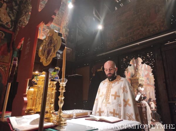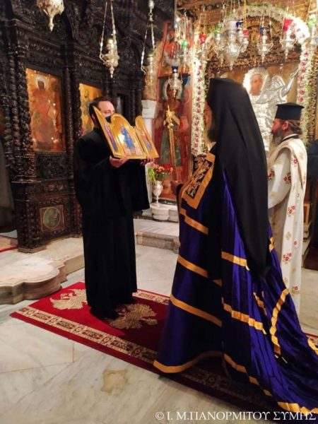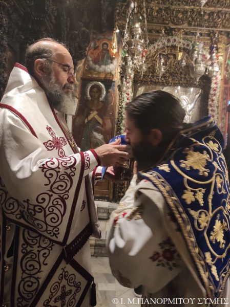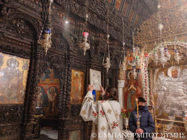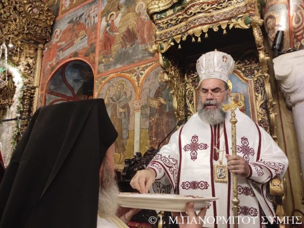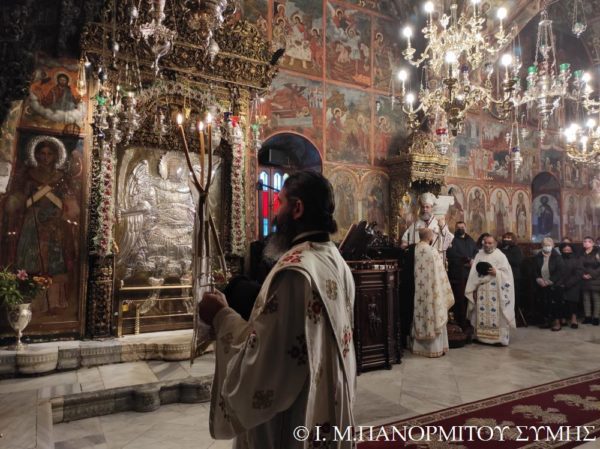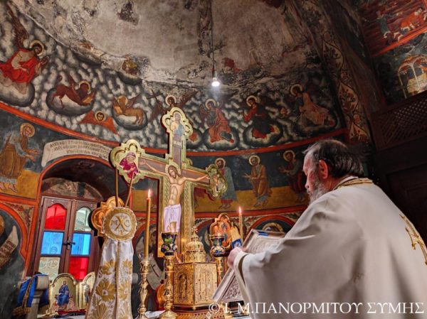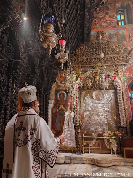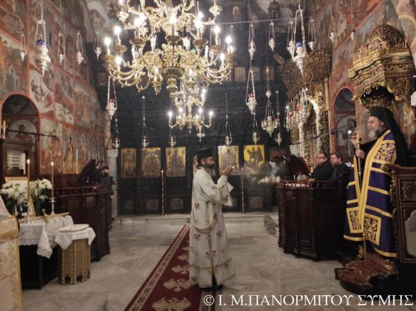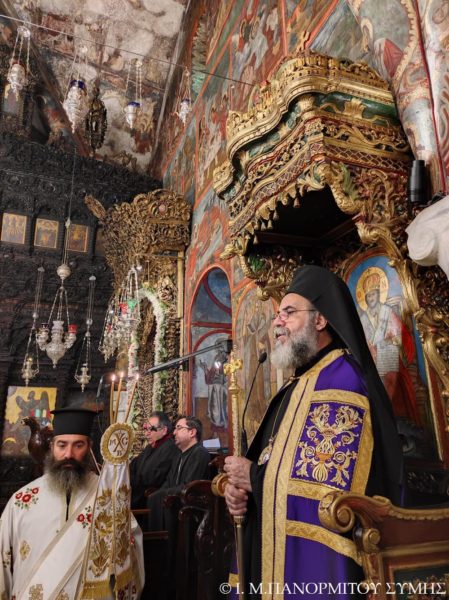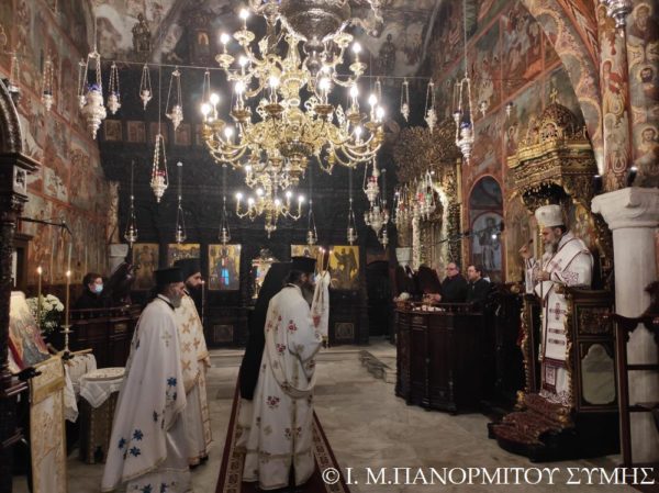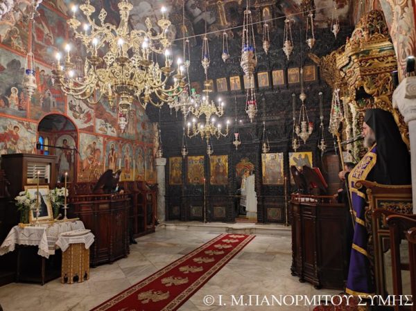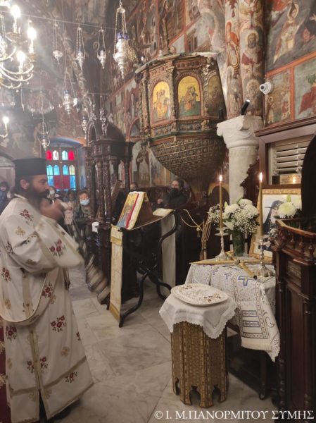Ο Σεβασμιώτατος Μητροπολίτης Σύμης κ. Χρυσόστομος, χοροστάτησε του Όρθρου, τέλεσε την Θεία Λειτουργία και εν συνεχεία μετά την απόλυση, προέστη του Ιερού Μνημοσύνου. Συλλειτουργοί του ήταν ο Πανοσιολ. Καθηγούμενος της Ι. Μονής, Αρχιμανδρίτης τού Οικουμενικού Θρόνου Αντώνιος Πατρός, ο Ιερομόναχος π. Ανδρέας Δημητρίου, ο Πρεσβύτερος π. Παντελεήμων Μακρόπουλος και ο Διάκονος π. Γεώργιος Κακακιός. Την ιερά υμνωδία απέδωσαν γλυκυφθόγγως ο Πρωτοψάλτης της Ι. Μονής κ. Μερκούριος Γιανναράς και ο Ιεροψάλτης της Ενορίας Ευαγγελισμού Σύμης κ. Αγαπητός Μιχελλής, αμφότεροι Αναγνώστες.