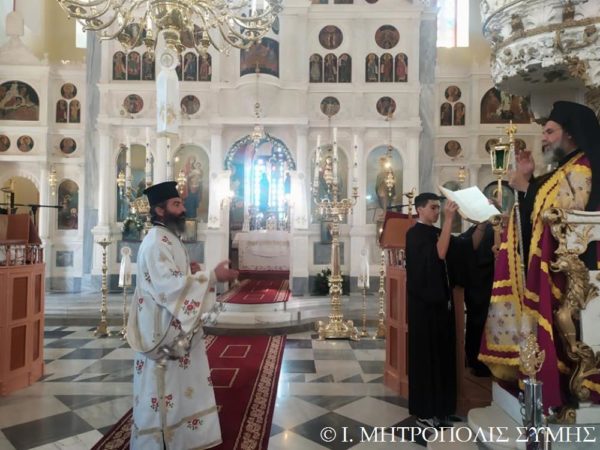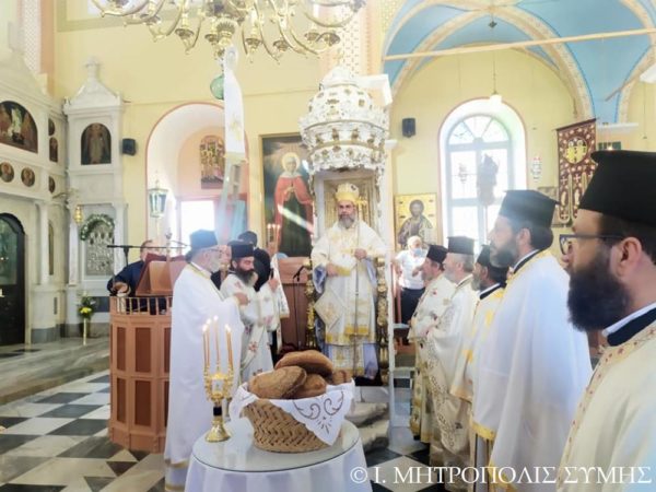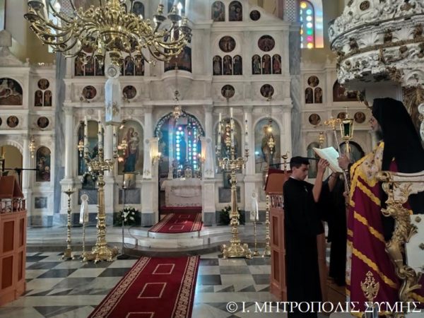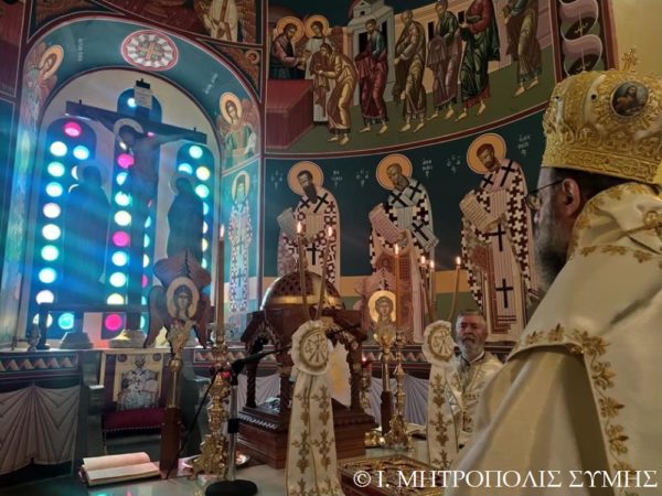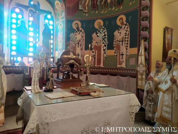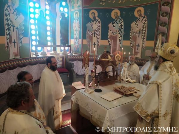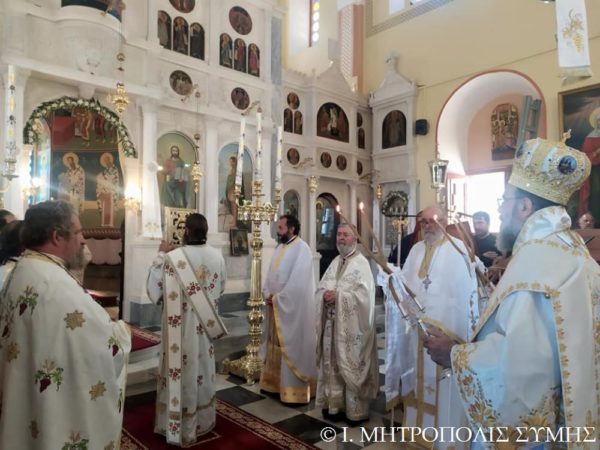 Ο Σεβασμιώτατος Μητροπολίτης Σύμης κ. Χρυσόστομος χοροστάτησε εις τον Όρθρον και τέλεσε την Θ. Λειτουργία, με συλλειτουργούς του άπαντας τους Ιερείς της Σύμης μετά του Διακόνου, ενώ τα ιερά αναλόγια διακόνησαν, οι Ιεροψάλτες του Ναού κ. Πανορμίτης Κακακιός, κ. Προκόπιος Χατζηχρυσάφης και οι φιλοξενούμενοι κ. Μερκούριος Γιανναράς, κ. Χαράλαμπος Κατσιμπρής, κ. Μιχαήλ Κυπριώτης, κ. Εμμανουήλ Κυπριώτης και κ. Μιχαήλ Τσαβαρής.