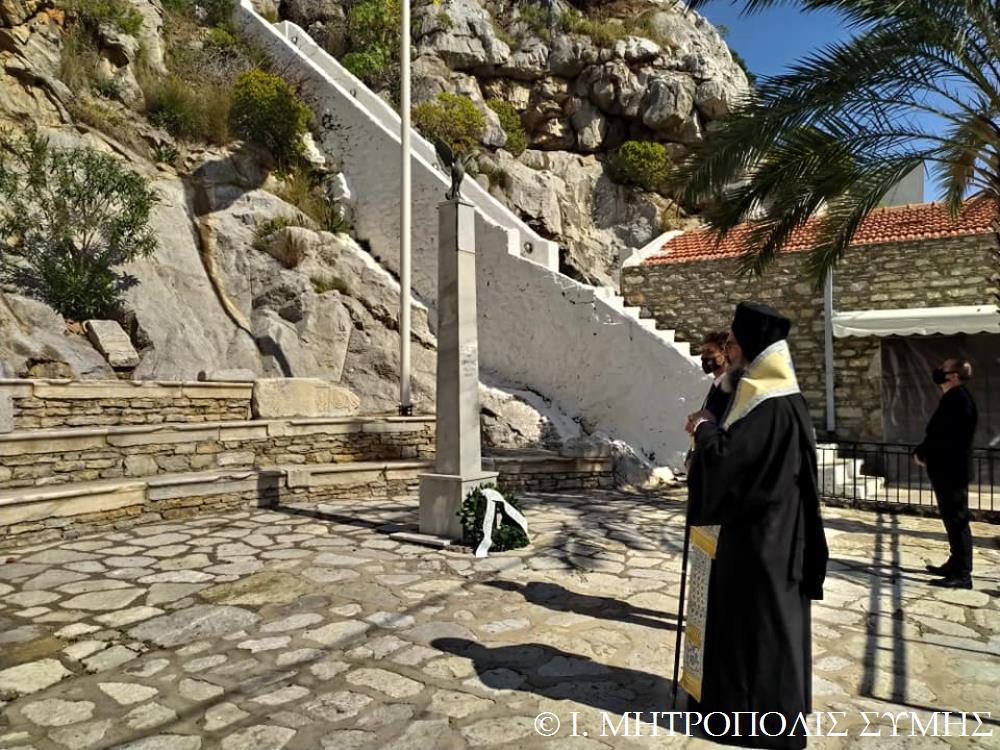 Ευθύς μετά την απόλυση και με την τήρηση των ισχυόντων υγειονομικών μέτρων, τελέσθηκε η καθιερωμένη πανηγυρική Δοξολογία στον Μητροπολιτικό Ι. Ναό χοροστατούντος του Σεβ. Μητροπολίτου, με μόνη την τιμητική παρουσία του Δημάρχου Σύμης κ. Ελευθερίου Παπακαλοδούκα και του Διοικητού Δ.Α.Ν. Σύμης. Εν συνεχεία ο Σεβασμιώτατος μετά του Δημάρχου, μετέβησαν εις το Ηρώον των Πεσόντων, όπου ετελέσθη υπό του Ποιμενάρχου μας Επιμνημόσυνη δέησις. Για λόγους προστασίας της δημόσιας υγείας, εφέτος δεν πραγματοποιήθηκε η καθιερωμένη παρέλαση.