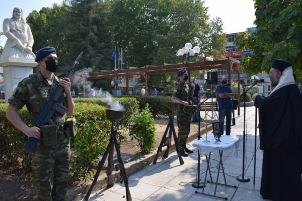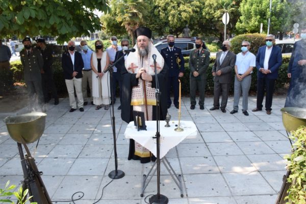 Στην συνέχεια ο Σεβασμιώτατος τέλεσε επιμνημόσυνη δέηση στην κεντρική πλατεία της πόλης των Τρικάλων. Εκεί έγινε και κατάθεση στεφάνων από φορείς της πόλης.