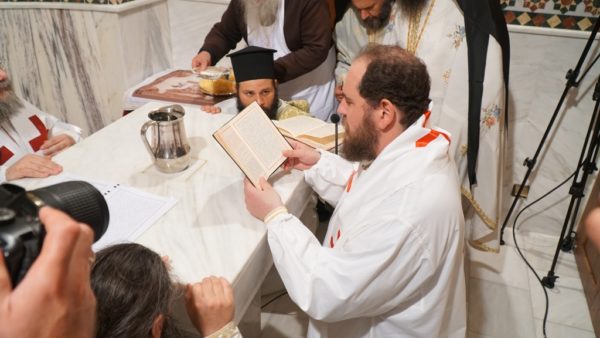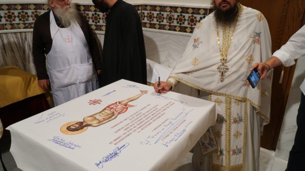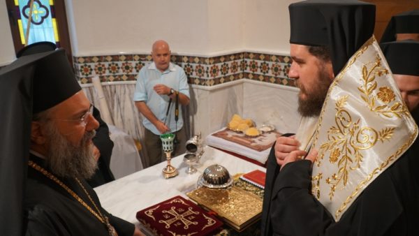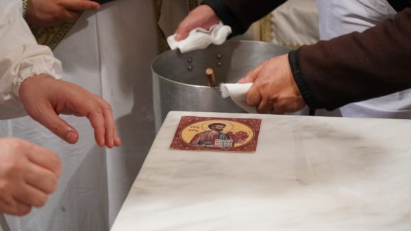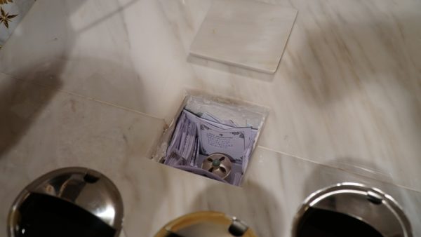 Προ της ενάρξεως της Ακολουθίας, ο Σεβασμιώτατος Μητροπολίτης Τρίκκης και Σταγών κ. Χρυσόστομος, μαζί με το Θεοφιλέστατο Επίσκοπο Πατάρων κ. Αθηναγόρα, Βοηθό του Σεβασμιωτάτου Αρχιεπισκόπου Καναδά κ. Σωτηρίου μετέφεραν στον υπό εγκαινιασμό Ιερό Ναό τα Μαρτυρικά Λείψανα τα οποία και εναπέθεσαν στην Αγία Τράπεζα τοποθετώντας τα επί του Αγίου Δισκαρίου, όπως ορίζει η εκκλησιαστική τάξη των εγκαινίων ψάλλοντας την ειδική Ακολουθία της υποδοχής των Λειψάνων η οποία περιέχει Μαρτυρικά τροπάρια εντός του Ιερού Βήματος.