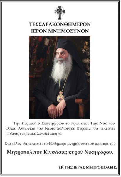 Η Ιερά Μητρόπολη Βέροιας ανακοινώνει, ότι την Κυριακή 5 Σεπτεμβρίου, στον Ιερό Ναό Οσίου Αντωνίου του Νέου, θα τελεστεί το Τεσσαρακονθήμερο μνημόσυνο του μακαριστού Μητροπολίτη Κινσάσας κυρού Νικηφόρου.