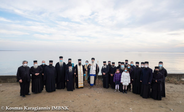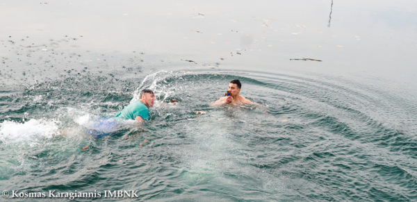 Αμέσως μετά ο Σεβασμιώτατος Μητροπολίτης κ. Παντελεήμων συνοδευόμενος από πατέρες της Ιεράς Μητροπόλεως μετέβη στον Θερμαϊκό κόλπο, πλησίον των εκβολών του Λουδία, όπου για τέταρτη φορά πραγματοποίησε την κατάδυση του Τιμίου Σταυρού.