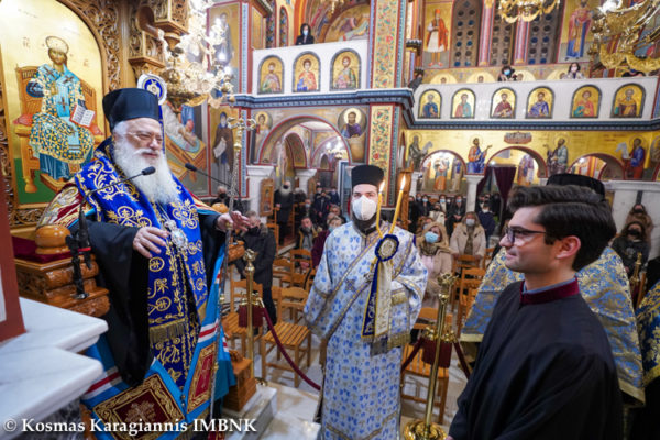 Στο τέλος του Πανηγυρικού Εσπερινού ο Σεβασμιώτατος Μητροπολίτης κ. Παντελεήμων χειροθέτησε Αναγνώστη τον κ. Χρήστο Ζερδαλή και ευλόγησε τη βασιλόπιτα της ενορίας.