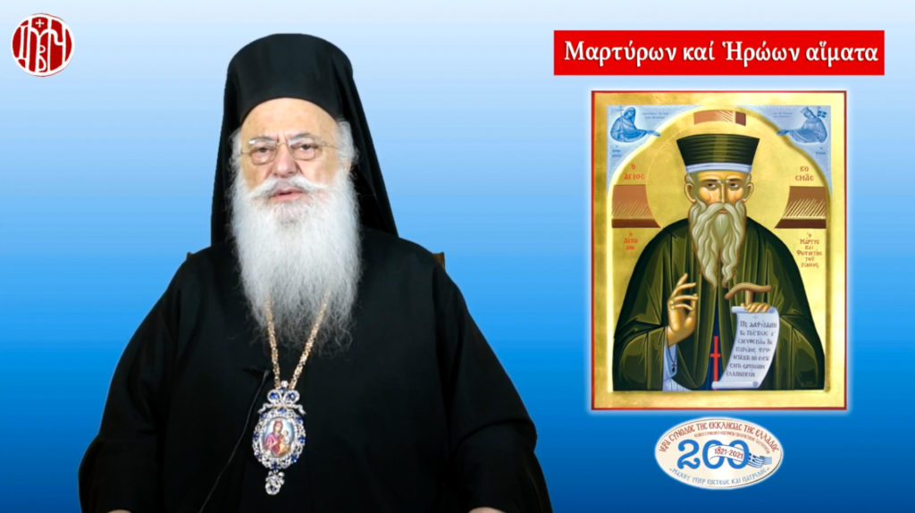 Πρόκειται για την τέταρτη ομιλία του Σεβασμιωτάτου Μητροπολίτου μας κ. Παντελεήμονος στη σειρά διαδικτυακών ομιλιών με τον γενικό τίτλο: «Μαρτύρων και Ηρώων αίματα», που μεταδίδει η Ιερά Μητρόπολη κάθε Πέμπτη στις 7:00 μ.μ. κατά την οποία αναπτύσσονται ιστορικά και αγιολογικά θέματα που σχετίζονται με την περίοδο της Τουρκοκρατίας και την Ελληνική Επανάσταση, την συνεισφορά της Εκκλησίας και του Ιερού Κλήρου στους αγώνες του Έθνους καθώς και με γεγονότα και πρόσωπα που διαδραμάτισαν σημαντικό ρόλο στην τοπική Εκκλησία.