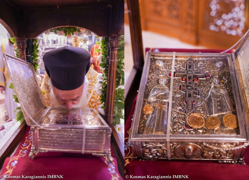 Σήμερα ὅμως δέν ἔχουμε μόνο τήν εὐλογία νά προσκυνήσουμε τόν τίμιο Σταυρό, ἀλλά νά προσκυνήσουμε ἕνα ἱερό κειμήλιο τῶν πατέρων μας, τόν τίμιο Σταυρό τῶν Κομνηνῶν, πού ὑποδεχθήκαμε πρό ὀλίγου ἀπό στό Ἱερό Προσκύνημα τῆς Παναγίας Σουμελᾶ, καί περιέχει τμῆμα τοῦ τιμίου Ξύλου.
