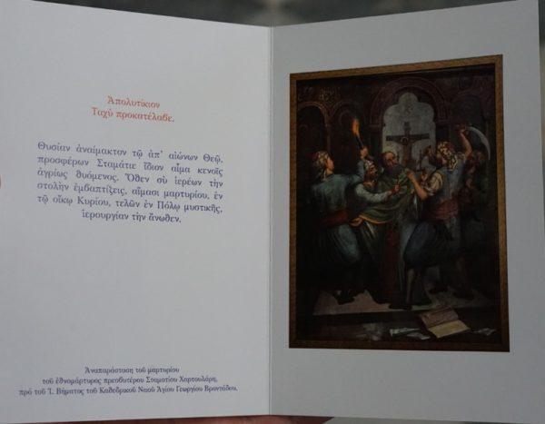 Το γεγονός αυτό αναμνήσθηκε σήμερα η Ιερά Μητρόπολις Χίου, Ψαρών και Οινουσσών στον Ιερό Καθεδρικό Ναό Αγίου Γεωργίου Βροντάδου κατά την Αρχιερατική Θεία Λειτουργία ιερουργούντος του Σεβασμιωτάτου Μητροπολίτου Χίου, Ψαρών και Οινουσσών κ. Μάρκου, μετά του Εφημερίου Πρωτοπρεσβυτέρου π. Ιωάννου Κοντού και του Αρχιδιακόνου π. Αποστόλου Λάρδα, ενώ έψαλαν ο Πρωτοψάλτης του Ιερού Ναού κ. Βασίλειος Χαμέτης και ο Λαμπαδάριος του Ιερού Ναού κ. Πέτρος Μαθιούδης.