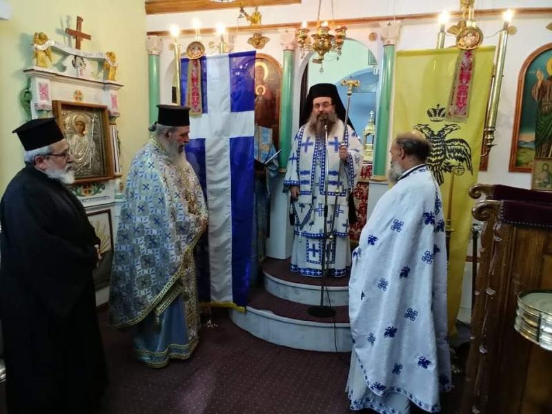 Ο Ιερός Ναός ήταν σημαιοστολισμένος με Βυζαντινά και Ελληνικά λάβαρα, ως συμβολισμό της αδιαπτώτου ιστορικής συνέχειας του Ελληνισμού και της συζεύξεως του με την αλήθεια και την αγάπη της Χριστιανικής Διδασκαλίας.