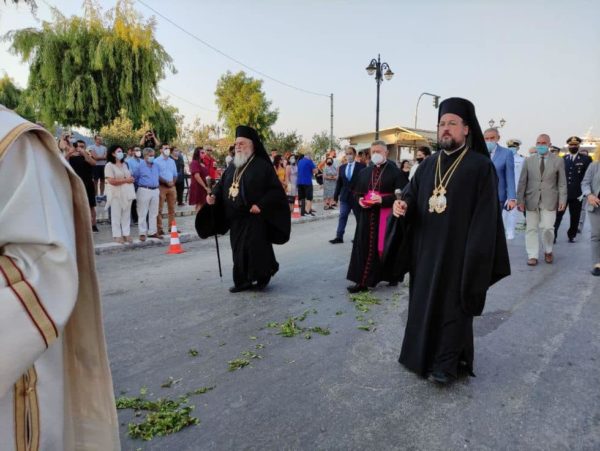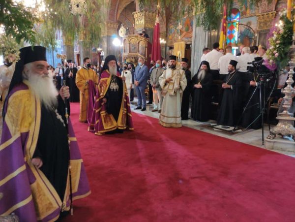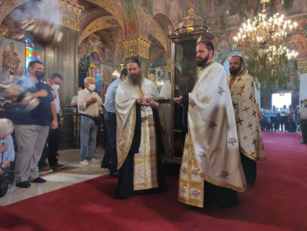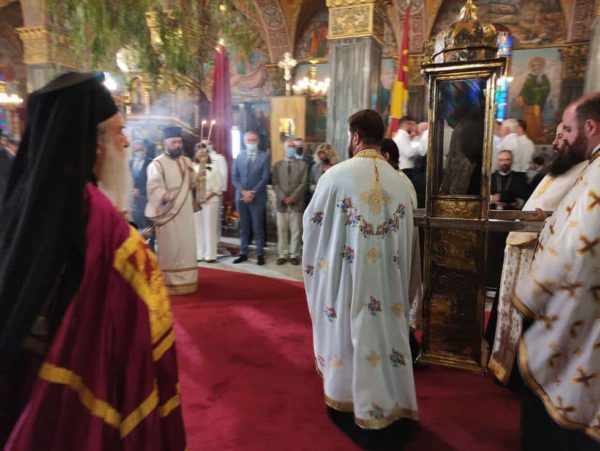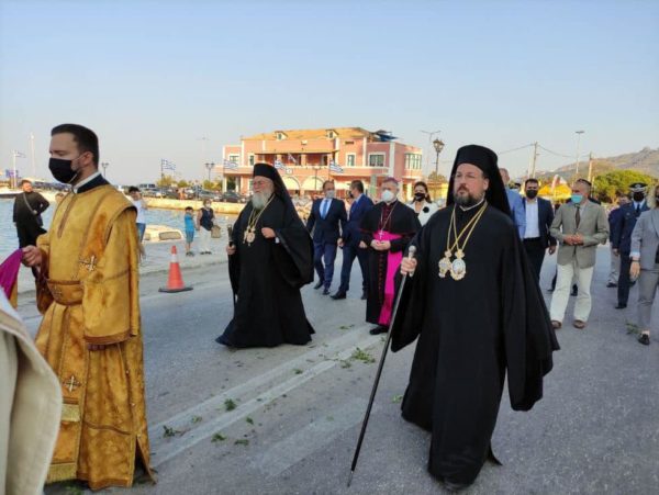 Πραγματοποιήθηκε σήμερα, 23.8.2021, στις 7 το απόγευμα η επίσημη κάθοδος του Μητροπολίτη Ζακύνθου κ. Διονυσίου από την Ιερά Μονή στον Ιερό Ναό. Αμέσως μετά, τελέστηκε η δοξολογία με περιφορά του σεπτού Σκηνώματος του Αγίου Διονυσίου, τέθηκε στη “Θύρα” του, όπου και προσκυνείται, έγινε δέηση ενώπιόν του και ο Αρχιερατικός Εσπερινός. Συμπροσευχόμενοι ήταν ο Σεβασμιώτατος Μητροπολίτης Δωδώνης κ. Χρυσόστομος και ο Σεβ. Μητροπολίτης Αξώμης Αιθιοπίας κ. Δανιήλ, καταγόμενος εκ Ζακύνθου.