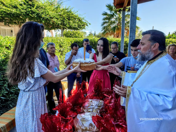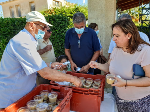 Μετά την πανηγυρική θεία Λειτουργία, στην ευσκιόφυλλη αυλή του Ναού, προσφέρθηκαν πλούσια κεράσματα, κυρίως δε ο πατροπαράδοτος “κουμπόστος”, ο οποίος έγινε -ως συνήθως- ανάρπαστος!