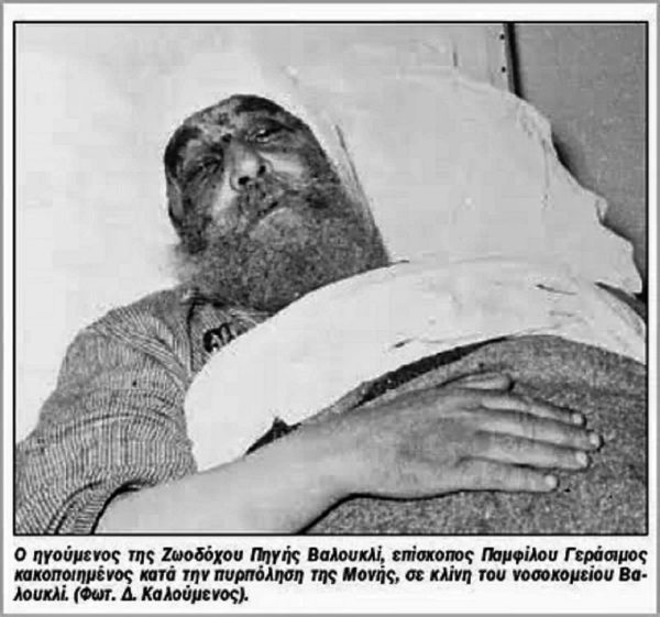 Ο μακαριστός Επίσκοπος Παμφίλου Γεράσιμος, ηγούμενος της μονής της Ζωοδόχου Πηγής, κλινήρης σε νοσοκομείο του Βαλουκλή μετά τον ξυλοδαρμό του κατά τη διάρκεια του πογκρόμ.