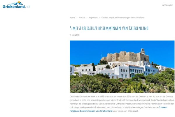 Πρόσφατα δημοσιεύματα από ολλανδικά ΜΜΕ κατέγραψαν τους ελληνικούς προορισμούς που είναι ελκυστικοί για επίσκεψη εφέτος. Ξεχωρίζει η λίστα με τους πέντε προτεινόμενους προορισμούς της Ελλάδας για θρησκευτικό τουρισμό, σύμφωνα με το Griekenland.net, «τουριστική πηγή» της Ολλανδίας αποκλειστικά για ταξίδια στην Ελλάδα.