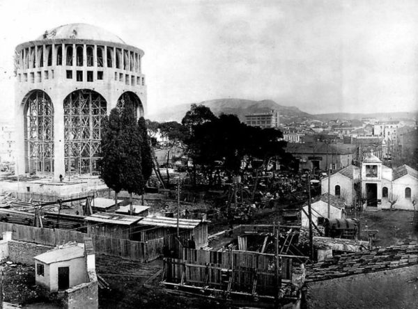 Ο Άγιος Παντελεήμων της οδού Αχαρνών, με τον “Μουτζούρη” να περνάει δίπλα του, με τον υπερμεγέθη τρούλο του Ναού υπό ανέγερση και στο βάθος ο παλιός Ναός καθώς και η Δημοτική πισίνα που λειτουργούσε εκεί όπως και σε όλες σχεδόν τις γειτονιές της παλιάς Αθήνας.
