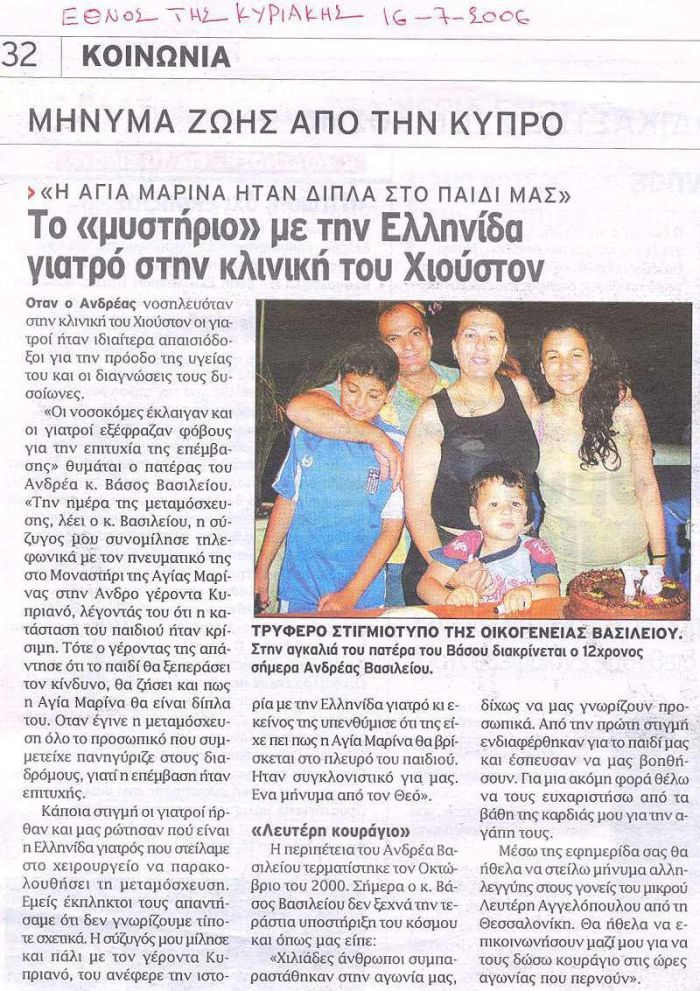 Η οικογένεια του Βάσου Βασιλείου, πατέρα του Ανδρέα, βρέθηκε σε πολύ δεινή θέση. Το μόσχευμα βρέθηκε και γρήγορα το παιδί ήταν στα χέρια κορυφαίων επιστημόνων στην Αμερική, προκειμένου να γίνει η πολύ λεπτή και σοβαρή χειρουργική επέμβαση. Πριν πάνε στην Αμερική η οικογένεια τηλεφώνησε στον ηγούμενο της Ιεράς Μονής Αγίας Μαρίνας της Άνδρου στον π. Κυπριανό προκειμένου να ζητήσουν να προσευχηθεί για τον Ανδρέα τους. Εντελώς αυθόρμητα ο ηγούμενος π. Κυπριανός είπε ότι θα προσευχηθεί στην Αγία και τους τόνισε να μην ανησυχούν, αφού στο χειρουργείο θα ήταν η Αγία Μαρίνα η ίδια!!!