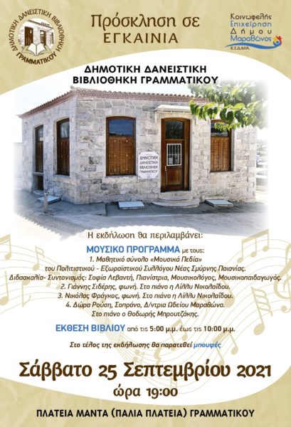22/09/2021 22/09/2021 Η Δανειστική Βιβλιοθήκη Γραμματικού (ΚΕΔΜΑ), ένα μοναδικό δημιούργημα του Δήμου Μαραθώνα εγκαινιάζεται αυτό το Σάββατο 25 Σεπτεμβρίου 2021.