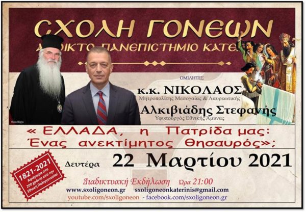 “ΕΛΛΑΔΑ, η Πατρίδα μας: ¨Ένας ανεκτίμητος θησαυρός”; Είναι το θέμα της τελευταίας εκδήλωσης από τις 11 εκδηλώσεις του αφιερώματος της Σχολής Γονέων – Ανοικτό Πανεπιστήμιο Κατερίνης για τα 200 χρόνια από την Εθνική μας Παλιγγενεσία. Προσκαλεσμένοι ομιλητές είναι ο Σεβασμιώτατος Μητροπολίτης Μεσογαίας & Λαυρεωτικής κ. Νικόλαος και ο Υφυπουργός Εθνικής Άμυνας κ. Αλκιβιάδης Στεφανής, οι οποίοι θα αναφερθούν στα ιδανικά με τα οποία “εμφορούνταν” οι πρόγονοι μας, στην αγάπη για την Πατρίδα και στον πολύτιμο θησαυρό της Ορθοδοξίας. Ιδανικά και Αξίες που θα πρέπει να διέπουν και εμάς τους απογόνους των ενδόξων προπατόρων μας.