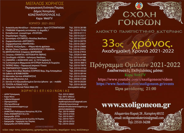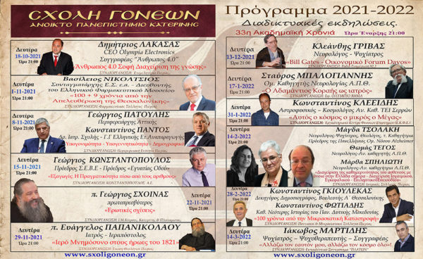 Με νέο πρόγραμμα και 16 προσωπικότητες όπου θα συμμετάσχουν στο προσεχές Ακαδημαϊκό έτος 2021-2022, η Σχολή Γονέων – Ανοικτό Πανεπιστήμιο Κατερίνης, συνεχίζει και φέτος τη λειτουργία της για 33η συνεχόμενη χρονιά.