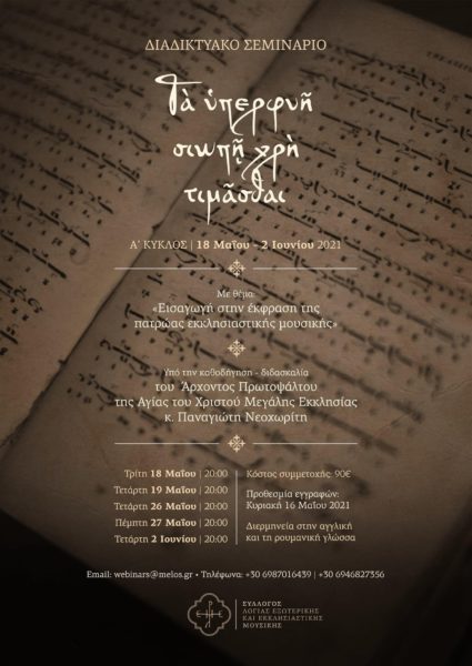 Διαδικτυακό Σεμινάριο με τίτλο: «Τα υπερφυῆ σιωπή χρή τιμάσθαι» και κεντρικό θέμα την «Εισαγωγή στην έκφραση της πατρώας εκκλησιαστικής μουσικής» διοργανώνει ο Σύλλογος Λόγιας και Εξωτερικής και Εκκλησιαστικής Μουσικής. Διδάσκων θα είναι ο Άρχων Πρωτοψάλτης της Αγίας του Χριστού Μεγάλης Εκκλησίας, Παναγιώτης Νεοχωρίτης και στόχος του σεμιναρίου η προσέγγιση όλων εκείνων των στοιχείων, που οδηγούν στη βελτίωση της έκφρασης και του προσανατολισμού των συμμετεχόντων στη λατρεία της Ορθοδόξου Ανατολικής Εκκλησίας, με παράλληλη αναφορά στη μεθοδική τους διδασκαλία.