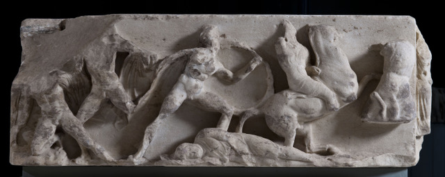 Θέμα της νότιας ζωφόρου του ναού της Αθηνάς Νίκης είναι πιθανότατα η νικηφόρα μάχη των Ελλήνων κατά των Περσών στον Μαραθώνα το 490 π.Χ., στην οποία πρωτοστάτησαν οι Αθηναίοι. Στη νότια πλευρά ένας έλληνας οπλίτης, στα αριστερά, βοηθά έναν συμπολεμιστή του, ο οποίος καταρρέει από το χτύπημα του βέλους ενός πέρση τοξότη που εικονίζεται στα δεξιά, στο άλλο άκρο του λίθου. Στο κέντρο ένας Έλληνας με ασπίδα στο αριστερό χέρι καταδιώκει έναν πέρση ιππέα, τη στιγμή που ένας ακόμα Πέρσης κείτεται στο έδαφος νεκρός.
