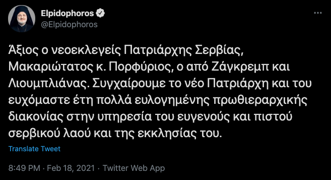 “Άξιος ο νεοεκλεγείς Πατριάρχης Σερβίας, Μακαριώτατος κ. Πορφύριος, ο από Ζάγκρεμπ και Λιουμπλιάνας. Συγχαίρουμε το νέο Πατριάρχη και του ευχόμαστε έτη πολλά ευλογημένης πρωθιεραρχικής διακονίας στην υπηρεσία του ευγενούς και πιστού σερβικού λαού και της εκκλησίας του.”, αναφέρει ο Σεβασμιώτατος.