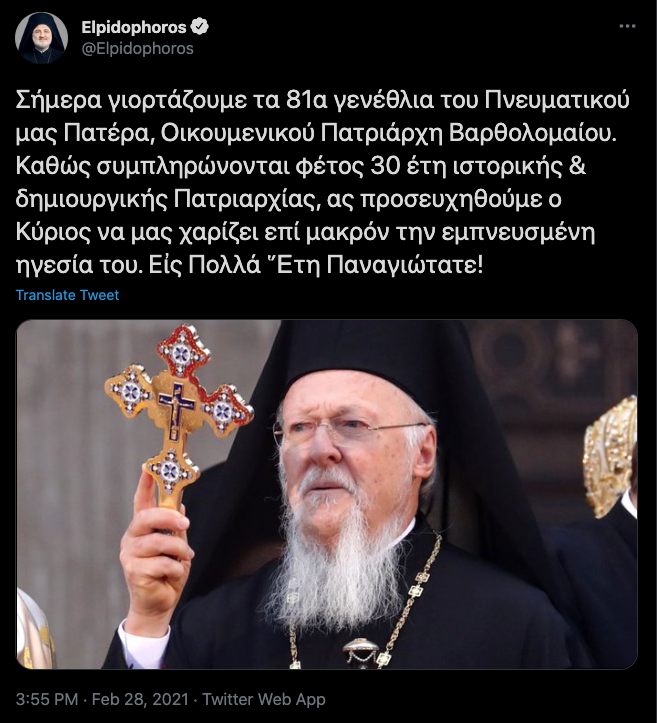 “Σήμερα γιορτάζουμε τα 81α γενέθλια του Πνευματικού μας Πατέρα, Οικουμενικού Πατριάρχη Βαρθολομαίου. Καθώς συμπληρώνονται φέτος 30 έτη ιστορικής & δημιουργικής Πατριαρχίας, ας προσευχηθούμε ο Κύριος να μας χαρίζει επί μακρόν την εμπνευσμένη ηγεσία του. Εἰς Πολλά Ἕτη Παναγιώτατε!”, αναφέρει το ευχετήριο μήνυμα του Σεβασμιωτάτου.