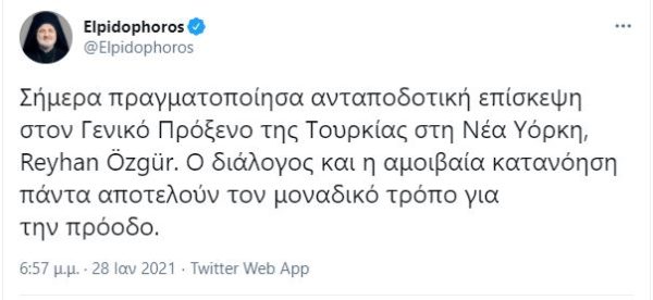 “Ο διάλογος και η αμοιβαία κατανόηση πάντα αποτελούν τον μοναδικό τρόπο για την πρόοδο” τονίζει ο Σεβασμιώτατος Αρχιεπίσκοπος Αμερικής κ. Ελπιδοφόρος μετά από ανταποδοτική επίσκεψη που πραγματοποίησε στον Γενικό Πρόξενο της Τουρκίας στη Νέα Υόρκη.