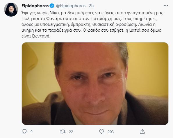 “Έφυγες νωρίς Νίκο, μα δεν μπόρεσες να φύγεις από την αγαπημένη μας Πόλη και το Φανάρι, ούτε από τον Πατριάρχη μας. Τους υπηρέτησες όλους με υποδειγματική, έμπρακτη, θυσιαστική αφοσίωση. Αιωνία η μνήμη και το παράδειγμά σου. Ο φακός σου έσβησε, η ματιά σου όμως είναι ζωντανή.”, αναφέρει το μήνυμα του Αρχιεπισκόπου Αμερικής.