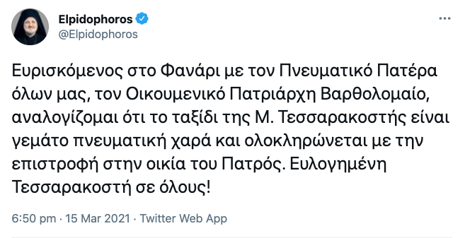 “Ευρισκόμενος στο Φανάρι με τον Πνευματικό Πατέρα όλων μας, τον Οικουμενικό Πατριάρχη Βαρθολομαίο, αναλογίζομαι ότι το ταξίδι της Μ. Τεσσαρακοστής είναι γεμάτο πνευματική χαρά και ολοκληρώνεται με την επιστροφή στην οικία του Πατρός. Ευλογημένη Τεσσαρακοστή σε όλους!”, αναφέρει ο Σεβασμιώτατος με σημερινό μήνυμα του (15/3) σε μέσο κοινωνικής δικτύωσης.