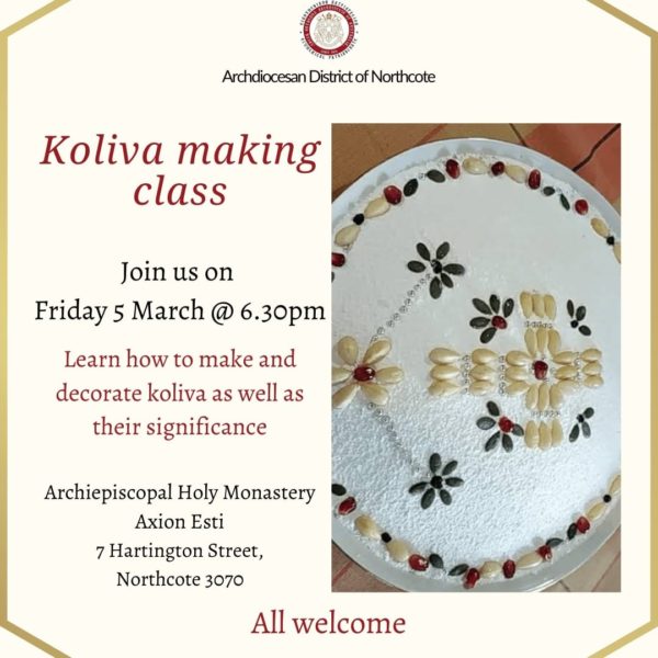 Με την ευκαιρία του Ψυχοσάββατου, ευλαβείς πιστοί της Αυστραλίας καλούνται να συμμετάσχουν την Παρασκευή 5 Μαρτίου στις 6.30 μμ, σε μια σύντομη διάλεξη που παρουσιάζεται από τον Αρχιμανδρίτη π. Ευμένιο Βασιλόπουλο για τα μνημόσυνα, τη σημασία των κολλύβων (βραστό και διακοσμημένο σιτάρι) και τη σημασία να συνεχίσουν οι πιστοί επί της Γης να προσεύχονται, να ενθυμούνται και να τιμούν όσους κοιμούνται.