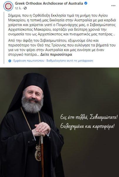 Κατά την Τρίτη 19 Ιανουαρίου που η Ορθόδοξη Εκκλησία τιμά τη μνήμη του Αγίου Μακαρίου, η τοπική Εκκλησία στην Αυστραλία χαίρει με μία καρδιά, γιατί ο Ποιμενάρχης της, ο Σεβασμιώτατος Αρχιεπίσκοπος κ.κ Μακάριος, εορτάζει για δεύτερη χρονιά τα ονομαστήρια του ως Αρχιεπίσκοπος και πνευματικός πατέρας.