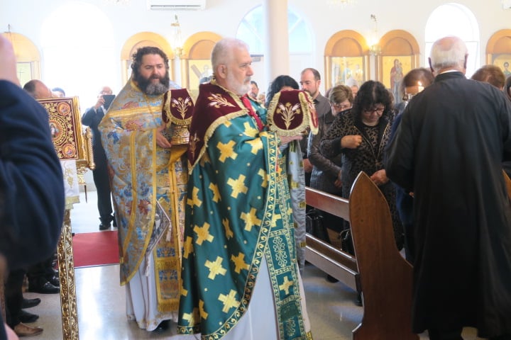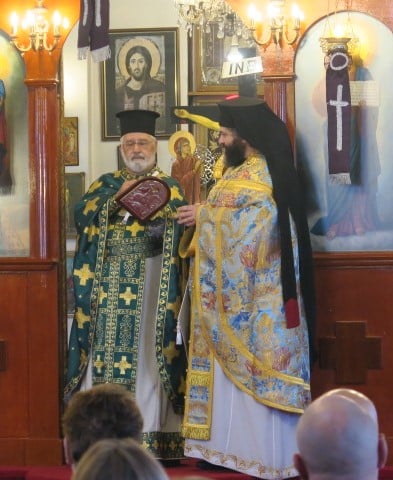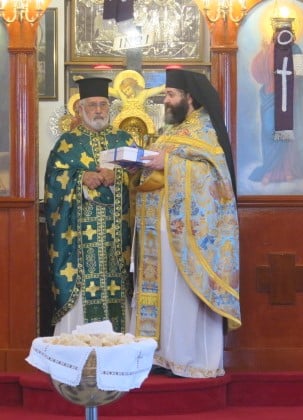 Επίσης, ο π. Πρόχορος μετέφερε στο εκκλησίασμα την αγάπη και τις ευλογίες του Σεβασμιωτάτου Αρχιεπισκόπου Αυστραλίας κ.κ. Μακαρίου, ενώ προσέφερε στον π. Παναγιώτη μία εικόνα του Αγίου Γεωργίου, με την ευκαιρία των 80ων γενεθλίων του.