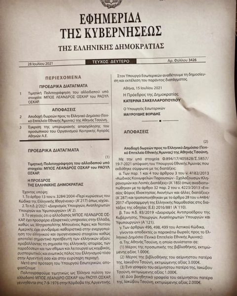 Η ύψιστη τιμή της πολιτογράφησης ως Έλληνας πολίτης αποδόθηκε στον Σεβ. Μητροπολίτη Μπουένος Άϊρες, Υπέρτιμο και Έξαρχο Νοτίου Αμερικής κ. Ιωσήφ για την προσφορά του στην Ελληνική Ομογένεια της Νοτίου Αμερικής, όπως ορίζει η ελληνική νομοθεσία και σύμφωνα με το σχετικό διάταγμα που υπέγραψε η Πρόεδρος της Ελληνικής Δημοκρατίας Κατερίνα Σακελλαροπούλου.