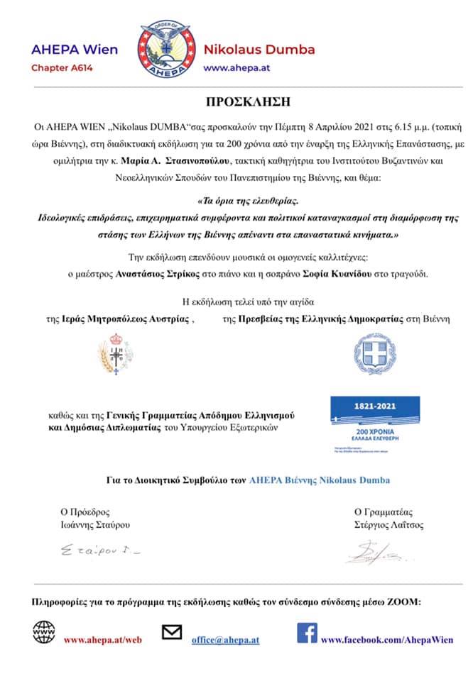 «Τα όρια της ελευθερίας. Ιδεολογικές επιδράσεις, επιχειρηματικά συμφέροντα και πολιτικοί καταναγκασμοί στη διαμόρφωση της στάσης των Ελλήνων της Βιέννης απέναντι στα επαναστατικά κινήματα”. Αυτό ήταν το θέμα της διαδικτυακής εκδήλωσης που πραγματοποιήθηκε από το Τμήμα AHEPA Βιέννης A614 «Νικόλαος Δούμπας» υπό την αιγίδα της Ιεράς Μητροπόλεως Αυστρίας, της Πρεσβείας της Ελλάδας στη Βιέννη, καθώς και της Γενικής Γραμματείας Απόδημου Ελληνισμού και Δημόσιας Διπλωματίας του Υπουργείου Εξωτερικών.