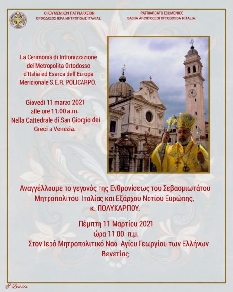 Στις 11 Μαρτίου 2021 προγραμματίστηκε να γίνει η ενθρόνιση του νέου Μητροπολίτου Ιταλίας και Εξάρχου Νότιας Ευρώπης κ. Πολυκάρπου. Η ενθρόνιση του Σεβασμιωτάτου θα γίνει στις 11 το πρωί στον Ιερό Μητροπολιτικό Ναό Αγίου Γεωργίου των Ελλήνων στη Βενετία.