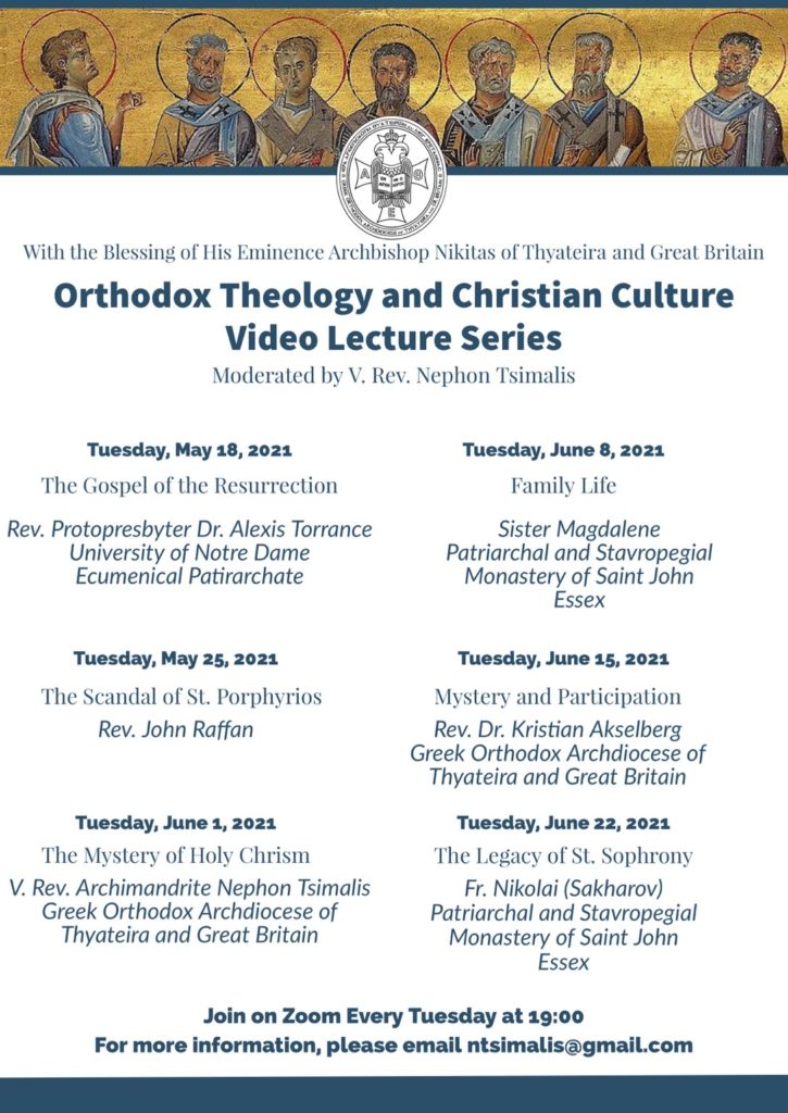 Από το φετινό Μάρτιο ξεκίνησε νέος κύκλος διαλέξεων υπό το γενικό θέμα «Ορθόδοξη Θεολογία και Χριστιανικός Πολιτισμός» με τη συμμετοχή διακεκριμένων εισηγητών από τη Μ. Βρεταννία και όλο τον κόσμο, όπως ο Θεοφιλέστατος Επίσκοπος Πατάρων κ. Αθηναγόρας, Κοσμήτορας της Πατριαρχικής Ορθόδοξης Ακαδημίας του Τορόντο, ο Θεοφιλέστατος Επίσκοπος Ιλίου κ. Ραφαήλ, Δρ.Θ., ο Πανοσιολογιώτατος καθηγούμενος της Ι.Μ. Τιμίου Προδρόμου Essex, π. Πέτρος, Δρ.Θ., ο Αιδεσιμολογιώτατος Πρωτοπρεσβύτερος π. Πορφύριος Georgi, καθηγητής Δογματικής Θεολογίας στη Θεολογική Σχολή Balamand του Λιβάνου, o Βρεταννός στην καταγωγή Αιδεσιμολογιώτατος Πρωτοπρεσβύτερος του Οικουμενικού Θρόνου π. Aλέξιος Torrance, αναπληρωτής καθηγητής Βυζαντινής Θεολογίας στο Πανεπιστήμιο Νotre Dame της Indiana, o καθηγητής Αντώνιος Καλδέλλης, Πρόεδρος του τμήματος κλασικών σπουδών του Πανεπιστημίου του Ohio και η αδελφή Μαγδαληνή της Ι. Μ. Τιμίου Προδρόμου Essex. Μερικά από τα θέματα που αναπτύσσονται στα πλαίσια αυτού του κύκλου είναι: Τα Εγκαίνια (Γενέθλιο) της Κωνσταντινούπολης, Η Μεγάλη Τεσσαρακοστή και η ευχή του Αγίου Εφραίμ του Σύρου, Ο Άγιος Γρηγόριος ο Παλαμάς και η Ορθόδοξη παράδοση, Η πνευματική παρακαταθήκη του Αγίου Σωφρονίου του Essex, ο Αρχιμανδρίτης Ιωάννης Maitland Moir: Άνθρωπος σταλμένος από το Θεό, Οικογενειακή Ζωή, Το Μυστήριο του Χρίσματος.