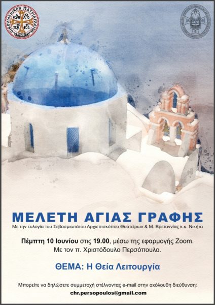 Η Αρχιεπισκοπή Θυατείρων και Μεγάλης Βρετανίας στα πλαίσια της «Μελέτη της Αγίας Γραφής» οργανώνει αύριο το απόγευμα διαδικτυακή ομιλία στα ελληνικά, με θέμα: «Η Θεία Λειτουργία».