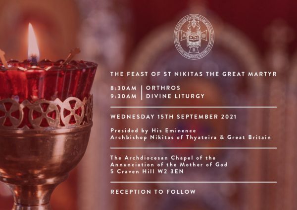 Ευχαρίστως σας ενημερώνουμε ότι την Τετάρτη 15 Σεπτεμβρίου 2021, μνήμη του Αγίου Μεγαλομάρτυρος Νικήτα, άγει τα ονομαστήριά του ο Σεβασμιώτατος Ποιμενάρχης μας, Αρχιεπίσκοπος Θυατείρων και Μεγάλης Βρεταννίας κ. Νικήτας.