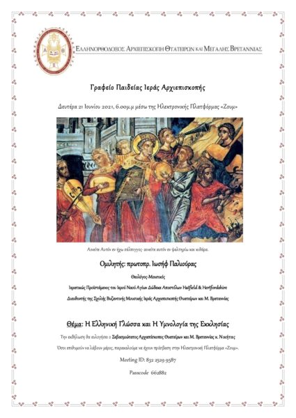 Το Γραφείο Ελληνικής Παιδείας της Αρχιεπισκοπής Θυατείρων και Μεγάλης Βρετανίας οργανώνει διαδικτυακή ομιλία στα ελληνικά, με θέμα «Η Ελληνική Γλώσσα και η Υμνολογία της Εκκλησίας» και σας προσκαλεί να ακούσετε τον Πρωτοπρεσβύτερο Ιωσήφ Παλιούρα, εφημέριο του Ιερού Ναού Δώδεκα Αποστόλων στο Hertfordshire, o οποίος θα αναπτύξει το θέμα.