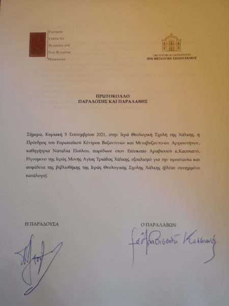 Πραγματοποιήθηκε την Κυριακή, 5 Σεπτεμβρίου 2021, στο πλαίσιο του υπό του Ευρωπαϊκού Κέντρου Βυζαντινών και Μεταβυζαντινών Μνημείων διοργανωθέντος στους χώρους της Σχολής οικολογικού συνεδρίου, η παράδοση της πολύ σημαντικής δωρεάς του Κέντρου προς την ιστορική Βιβλιοθήκη της Θεολογικής Σχολής, διά της υπογραφής του σχετικού πρωτοκόλλου από τον Καθηγούμενο, Θεοφιλέστατο Επίσκοπο Αραβισσού κ. Κασσιανό, και την Πρόεδρο του Ιδρύματος, κ. Ν. Πούλου.