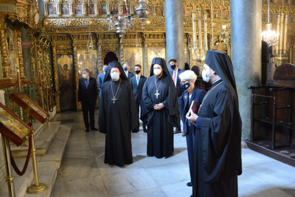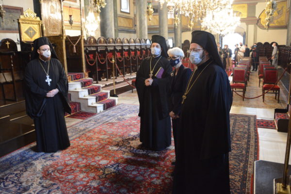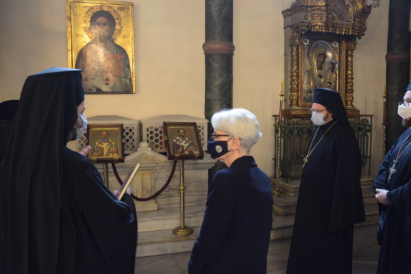 Στα προπύλαια του Πατριαρχείου την Εξοχ. κ. Υπουργό, η οποία συνοδευόταν από τον Πρέσβη των ΗΠΑ στην Άγκυρα Εξοχ. κ. David Satterfield και συνεργάτες της, καλωσόρισαν οι Πανοσιολ. Μ. Πρωτοσύγκελλος κ. Θεόδωρος, Αρχιμ. κ. Γρηγόριος, Αρχιγραμματέας της Αγίας και Ιεράς Συνόδου, και Μ. Σύγκελλος κ. Ιάκωβος.