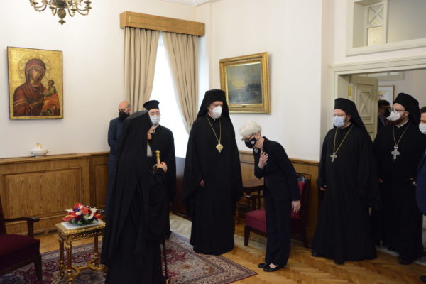 Στη συνέχεια, την υψηλή επισκέπτρια υποδέχθηκε εγκαρδίως ο Παναγιώτατος Οικουμενικός Πατριάρχης κ.κ. Βαρθολομαίος, ο οποίος εξέφρασε τη χαρά του για την επίσκεψή της.