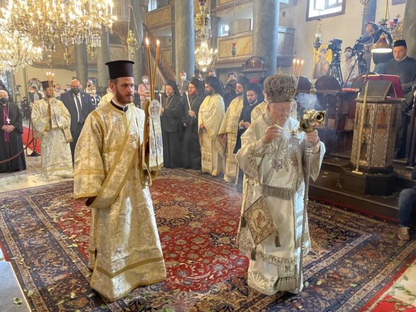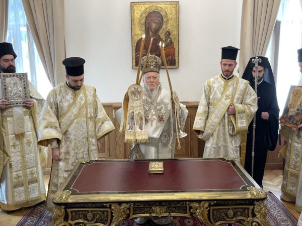 Ο Παναγιώτατος Οικουμενικός Πατριάρχης, αφού ενδύθηκε με τα Αρχιερατικά άμφια στην Αίθουσα Ακροάσεων του Πατριαρχείου, περιστοιχιζόμενος από τους Σεβ. Μητροπολίτες Φιλαδελφείας κ. Μελίτωνα, Μυριοφύτου και Περιστάσεως κ. Ειρηναίο, Μύρων κ. Χρυσόστομο, Σαράντα Εκκλησιών κ. Ανδρέα, και Προύσης κ. Ιωακείμ, και από τους κληρικούς της Πατριαρχικής Αυλής, έφθασε στον Πατριαρχικό Ναό και τέλεσε τον Εσπερινό.