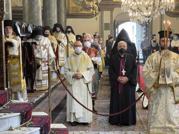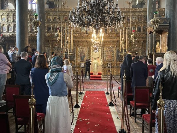 Εκκλησιάστηκαν η Γενική Πρόξενος της Ελλάδος στην Πόλη, Ευγεν. κ. Γεωργία Σουλτανοπούλου, με τον σύζυγό της, Πρέσβη κ. Ιωάννη Ραπτάκη, ο Αναπληρωτής Υπουργός Εξωτερικών της Ουκρανίας Εξοχ. Yevgueniy Yenin, με στελέχη του Γεν. Προξενείου της χώρας του στην Πόλη, Άρχοντες Οφφικιάλιοι του Οικουμενικού Θρόνου με επί κεφαλής τον Εντιμολ. κ. Κωνσταντίνο Δεληκωσταντή, Άρχοντα Διδάσκαλο του Γένους της Μ.τ.Χ.Ε. και Γεν. Γραμματέα της Αδελφότητας Οφφικιαλίων του Οικουμενικού Πατριαρχείου «Παναγία ἡ Παμμακάριστος», και πλήθος πιστών από την Πόλη και το εξωτερικό.