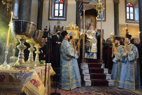 Ο Παναγιώτατος, μετά τον Όρθρο, κατά τον οποίο χοροστάτησε, τέλεσε τον Μεγάλο Αγιασμό, και στη συνέχεια προέστη της Θείας Λειτουργίας, συλλειτουργούντων των Σεβ. Αρχιερέων Φιλαδελφείας κ. Μελίτωνος, Ανθηδώνος κ. Νεκταρίου, Επιτρόπου του Παναγίου Τάφου στην Πόλη, Μυριοφύτου και Περιστάσεως κ. Ειρηναίου, Μύρων κ. Χρυσοστόμου, Κυρηνείας κ. Χρυσοστόμου, από την Εκκλησία της Κύπρου, και Προύσης κ. Ιωακείμ.
