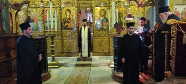 Ο Πανιερώτατος και η συνοδεία του έγιναν δεκτοί από τον Καθηγούμενο, Θεοφιλέστατο Επίσκοπο Αραβισσού κ. Κασσιανό, και την περί αυτόν αδελφότητα και ξεναγήθηκαν στους χώρους της Σχολής. Στη συνέχεια ο Πανιερώτατος χοροστάτησε από του παραθρονίου κατά τον προεόρτιο της Γεννήσεως της Θεοτόκου Εσπερινό στο ναΰδριο της Σχολής.