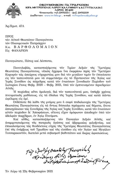 Ευχαριστήρια επιστολή προς τον Παναγιώτατο Οικουμενικό Πατριάρχη κ. κ. Βαρθολομαίο απέστειλε ο Σεβασμιώτατος Μητροπολίτης Λέρου, Καλύμνου και Αστυπάλαιας, κ. Παΐσιος, επί τη λήξη της θητείας συμμετοχής του στην Αγία και Ιερά Σύνοδο του Οικουμενικού Πατριαρχείου, η οποία διήρκησε από τον Φεβρουάριο του 2020 έως τον Φεβρουάριο του 2021.