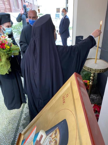 Ιερομάρτυρος Πατριάρχου, άναψε κερί, κατέθεσε ανοιξιάτικα άνθη και προσευχήθηκε, επικαλούμενος τη χάρη και τη μεσιτεία του Αγίου Προκατόχου αυτού, υπέρ της Εκκλησίας και του Γένους.