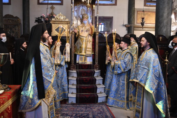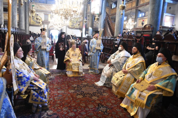 Ο Παναγιώτατος, μετά τον Όρθρο, κατά τον οποίο χοροστάτησε, τέλεσε τον Μεγάλο Αγιασμό, και στη συνέχεια προέστη της Θείας Λειτουργίας, συλλειτουργούντων των Σεβ. Αρχιερέων Φιλαδελφείας κ. Μελίτωνος, Ανθηδώνος κ. Νεκταρίου, Επιτρόπου του Παναγίου Τάφου στην Πόλη, Μύρων κ. Χρυσοστόμου,Καλλιουπόλεως και Μαδύτου κ. Στεφάνου, και Κυδωνιών κ. Αθηναγόρα.