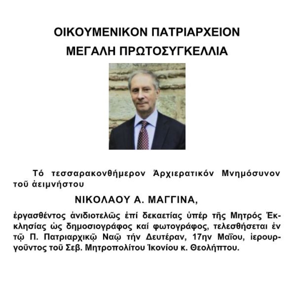 Το τεσσαρακονθήμερο Αρχιερατικό Μνημόσυνο του αειμνήστου ΝΙΚΟΛΑΟΥ Α. ΜΑΓΓΙΝΑ, εργασθέντος ανιδιοτελώς επί δεκαετίας υπέρ της Μητρός Εκκλησίας ως δημοσιογράφος και φωτογράφος, θα τελεσθεί στον Πατριαρχικό Ναό την Δευτέρα, 17ην Μαίου, ιερουργούντος του Σεβ. Μητροπολίτου Ικονίου κ. Θεολήπτου.