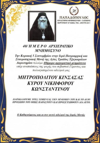 Τεσσαρακονθήμερο Αρχιερατικό μνημόσυνο στην μνήμη του μακαριστού μητροπολίτη Κινσάσας κυρού Νικηφόρου, θα τελεστεί στην Ιερά Πατριαρχική και Σταυροπηγιακή Μονή της Αγίας Τριάδος Τζαγκαρόλων Ακρωτηρίου Χανίων, την Κυριακή 5 Σεπτεμβρίου. Στην Ιερά Μονή όπου το 1971 εκάρη μοναχός.
